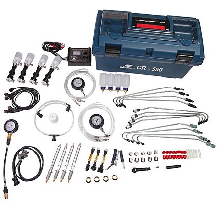 Стенд для промывки форсунок. Комплект предназначен для очистки топливной системы инжекторов без демонтажа форсунок. Данный набор также очищает и детали цилиндро-поршневой группы, из-за того, что принцип работы данного устройства основан на подаче чистящего вещества в цилиндры двигателя вместо обычного топлива. Для очистки используют специальную промывочную жидкость типа Лавр или Wynns.