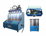 Стенд для проверки и промывки 6 инжекторов в ультразвуковой ванне. Автоматический слив тестирующей жидкости. Работает от сжатого воздуха. Имитация работы форсунок происходит с помощью встроенного электронного блока управления форсунками. В комплект поставки входит ультразвуковая ванна объемом 2,0 литра с подогревом и мощностью генератора 60 ВТ.