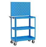 Корпус выполнен из листовой стали толщиной от 0,6 до 1,5 мм., покрыт полимерной порошковой краской. С перфорированной панелью для навесных элементов. Общая равномерно-распределённая нагрузка на тележку - до 100 кг. Верхняя и средняя полка имеют высоту борта 40 мм., нижняя полка имеет высоту борта 60 мм. Размер 950х800х450 мм.