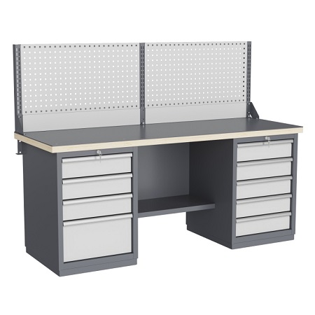 Двухтумбовый. Допустимая нагрузка на столешницу 1000 кг. Опорные элементы выполнены сварными из холоднокатаной стали. Для выполнения сборочных, ремонтных, слесарных, монтажных и других видов работ на производстве, в сервисных центрах, мастерских, гаражах, а также для обучения технологии в учебных заведениях. Комплектуется полкой-стенкой, расположенной под столешницей для удобного размещения габаритного инструмента и оснастки. Размеры верстака: 855x1596x696 мм. Вес: 82 кг. Поставляется в 4 комплектациях на выбор.