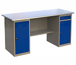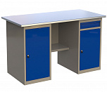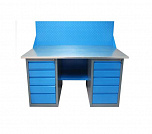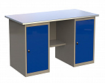 Верстак двухтумбовый поставляется в разобранном виде (4 элемента). Нагрузка на столешницу до 600 кг. Стандартный цвет: корпус - серый глянец RAL 7030, ящики и двери тумб - синий RAL 5017. Размеры:855x1400x700 мм. Масса: 111 кг.