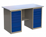 Верстак двухтумбовый поставляется в разобранном виде (4 элемента). Нагрузка на столешницу до 600 кг. Стандартный цвет: корпус - серый глянец RAL 7030, ящики и двери тумб - синий RAL 5017. Размеры:855x1400x700 мм. Масса: 81 кг.