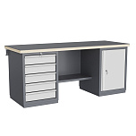 Двухтумбовый. Допустимая нагрузка на столешницу 1000 кг. Опорные элементы выполнены сварными из холоднокатаной стали. Для выполнения сборочных, ремонтных, слесарных, монтажных и других видов работ на производстве, в сервисных центрах, мастерских, гаражах, а также для обучения технологии в учебных заведениях. Комплектуется полкой-стенкой, расположенной под столешницей для удобного размещения габаритного инструмента и оснастки. Размеры верстака: 855x1796x696 мм. Вес: 133 кг. Поставляется в 4 комплектациях на выбор.