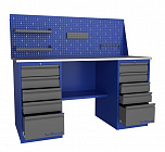 Двухтумбовый. Допустимая нагрузка на столешницу 1000 кг. Опорные элементы выполнены сварными из холоднокатаной стали. Для выполнения сборочных, ремонтных, слесарных, монтажных и других видов работ на производстве, в сервисных центрах, мастерских, гаражах, а также для обучения технологии в учебных заведениях. Комплектуется полкой-стенкой, расположенной под столешницей для удобного размещения габаритного инструмента и оснастки. Размеры верстака: 855x1596x696 мм. Вес: 127 кг. Поставляется в 4 комплектациях на выбор.