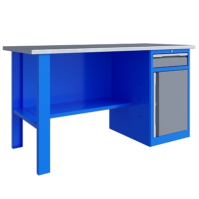 Верстак однотумбовый поставляется в разобранном виде. Нагрузка на столешницу до 600 кг. Стандартный цвет: корпус - серый глянец RAL 7030, ящики и двери тумб - синий RAL 5017. Размеры:855x1400x700 мм. Вес: 86 кг.