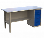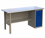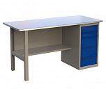 Однотумбовый. Допустимая нагрузка на столешницу 750 кг. Опорные элементы выполнены сварными из холоднокатаной стали. Верстак состоит из столешницы, опоры, тумбы P3 с тремя большими ящиками, полки-стенки и одинарного экрана с кронштейнами. Все металлические элементы покрыты полиэфирной порошковой краской. Столешница состоит из фанеры марки ФСФ толщиной 24 мм, которая покрыта лаком-антисептиком и листом оцинкованной холоднокатаной стали толщиной 1,2 мм. Размеры (ВхШхГ) 1470x1196x696 мм.