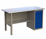Однотумбовый. Допустимая нагрузка на столешницу 750 кг. Опорные элементы выполнены сварными из холоднокатаной стали. Верстак состоит из столешницы, опоры, тумбы P4 с двумя малыми и двумя большими ящиками и полки-стенки. Все металлические элементы покрыты полиэфирной порошковой краской. Столешница состоит из фанеры марки ФСФ толщиной 24 мм, которая покрыта лаком-антисептиком и листом оцинкованной холоднокатаной стали толщиной 1,2 мм. Размеры (ВхШхГ) 855x1396x696 мм.