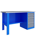 Однотумбовый. Допустимая нагрузка на столешницу 750 кг. Опорные элементы выполнены сварными из холоднокатаной стали. Верстак состоит из столешницы, опоры, тумбы P4 с двумя малыми и двумя большими ящиками, полки-стенки и одинарного экрана с кронштейнами. Все металлические элементы покрыты полиэфирной порошковой краской. Столешница из фанеры марки ФСФ толщиной 24 мм, которая покрыта лаком-антисептиком и листом оцинкованной холоднокатаной стали толщиной 1,2 мм. Размеры (ВхШхГ) 1470x1196x696 мм.