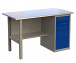 Однотумбовый. Допустимая нагрузка на столешницу 750 кг. Опорные элементы выполнены сварными из холоднокатаной стали. Верстак состоит из столешницы, опоры, тумбы P3 с тремя большими ящиками, полки-стенки и одинарного экрана с кронштейнами. Все металлические элементы покрыты полиэфирной порошковой краской. Столешница состоит из фанеры марки ФСФ толщиной 24 мм, которая покрыта лаком-антисептиком и листом оцинкованной холоднокатаной стали толщиной 1,2 мм. Размеры (ВхШхГ) 1470x1396x696 мм.