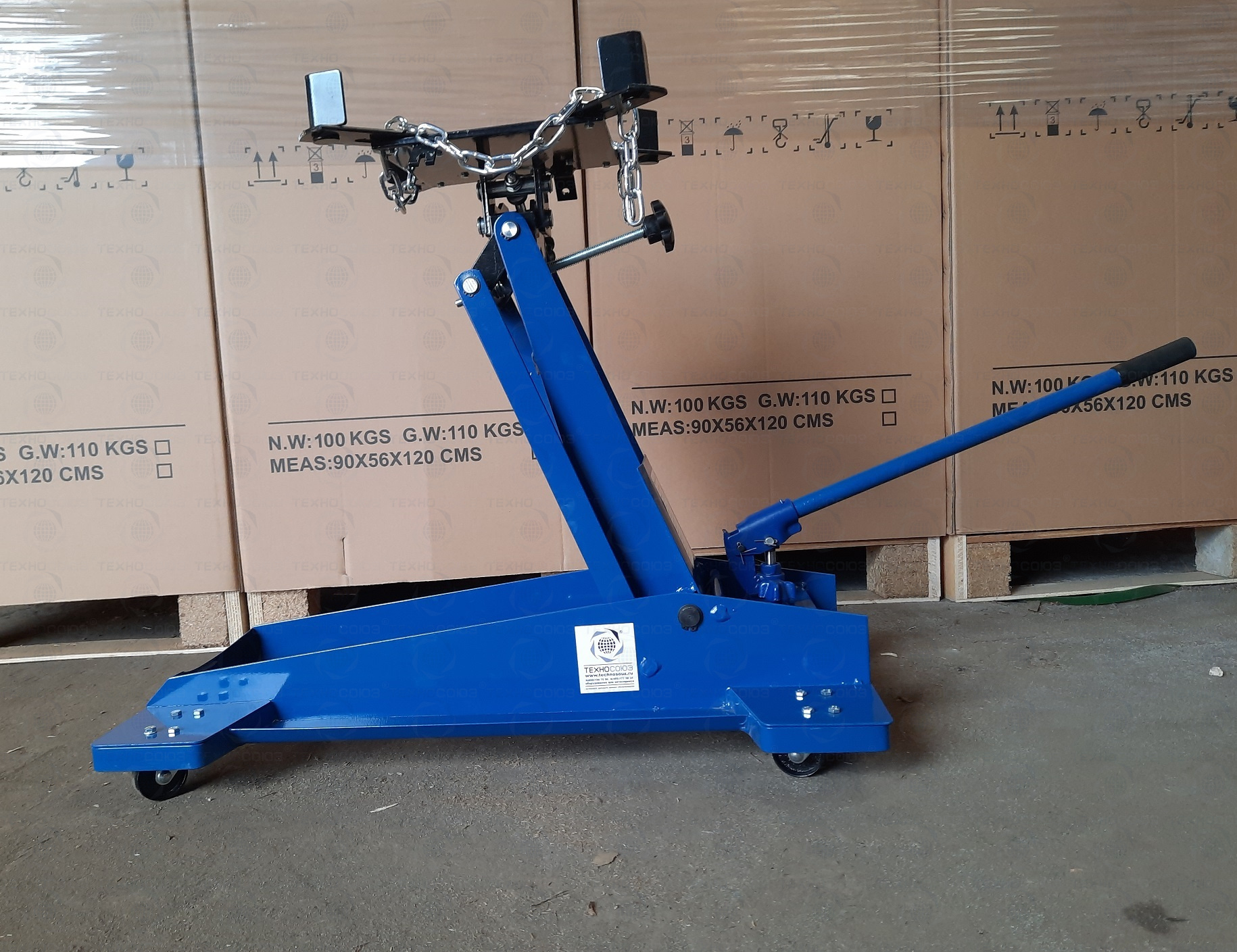 Трансмиссионная гидравлическая стойка домкрат -  является мобильным подъёмным устройством. С ее помощью можно поднять и переместить снятый узел. При подъеме на требуемую высоту удобно монтировать снятый агрегат. Цвет темно-синий.