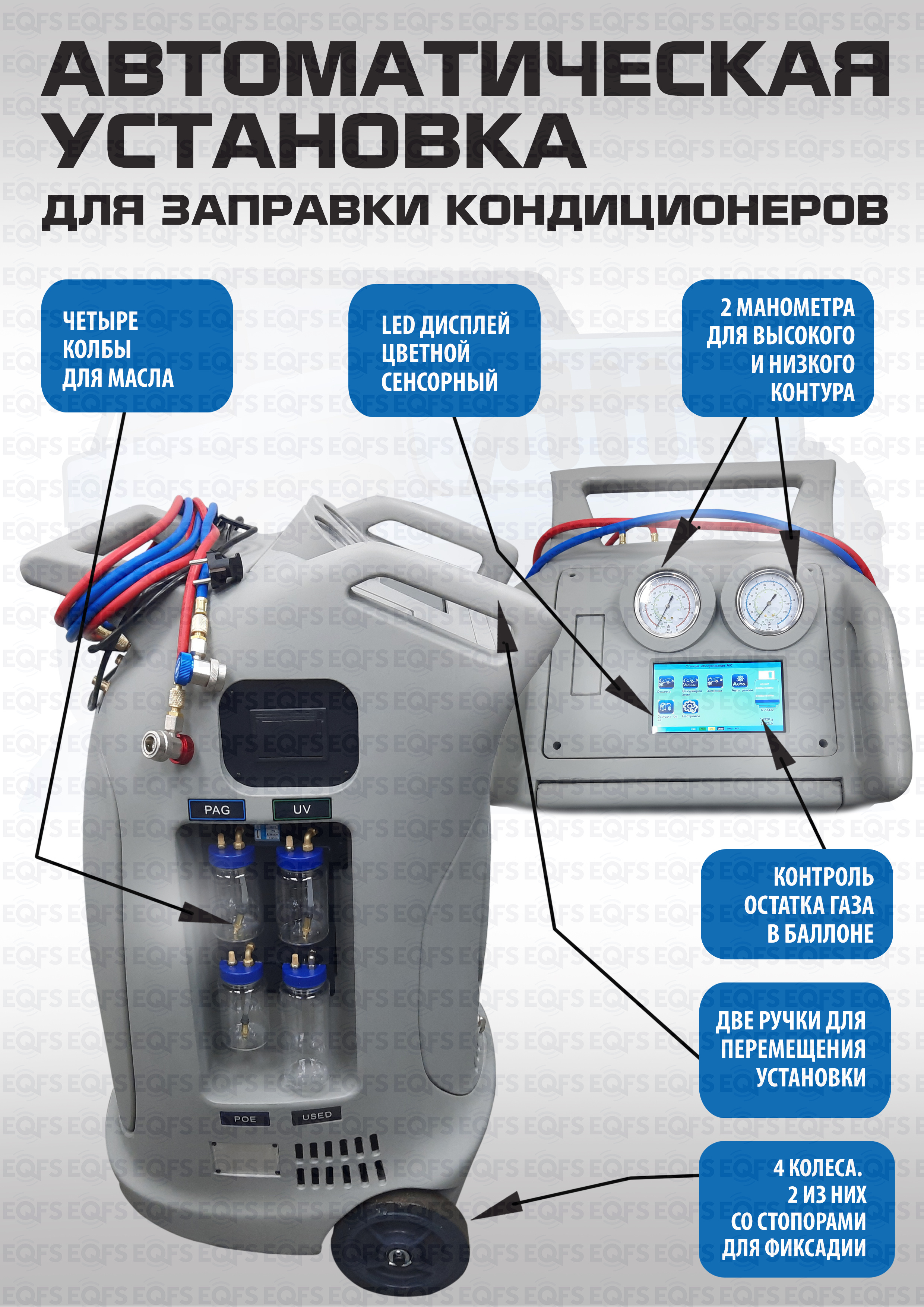 Автоматически выполняет отбор, восстановление и заправку хладагента. Гарантирует полное обезвоживание системы. Кроме того, дополнительно установленный термопринтер, позволяет выводить на печать технические данные по кондиционерам более 6000 автомобилей. Транспортировочные колеса со стопорами. Цветной сенсорный LCD дисплей. Программное обеспечение позволяет производить тестирование основных рабочих узлов станции, на предмет работоспособности. Меню на Русском языке. Сама установка напоминает о регулярном обслуживании после заправки 150-200 автомобилей.