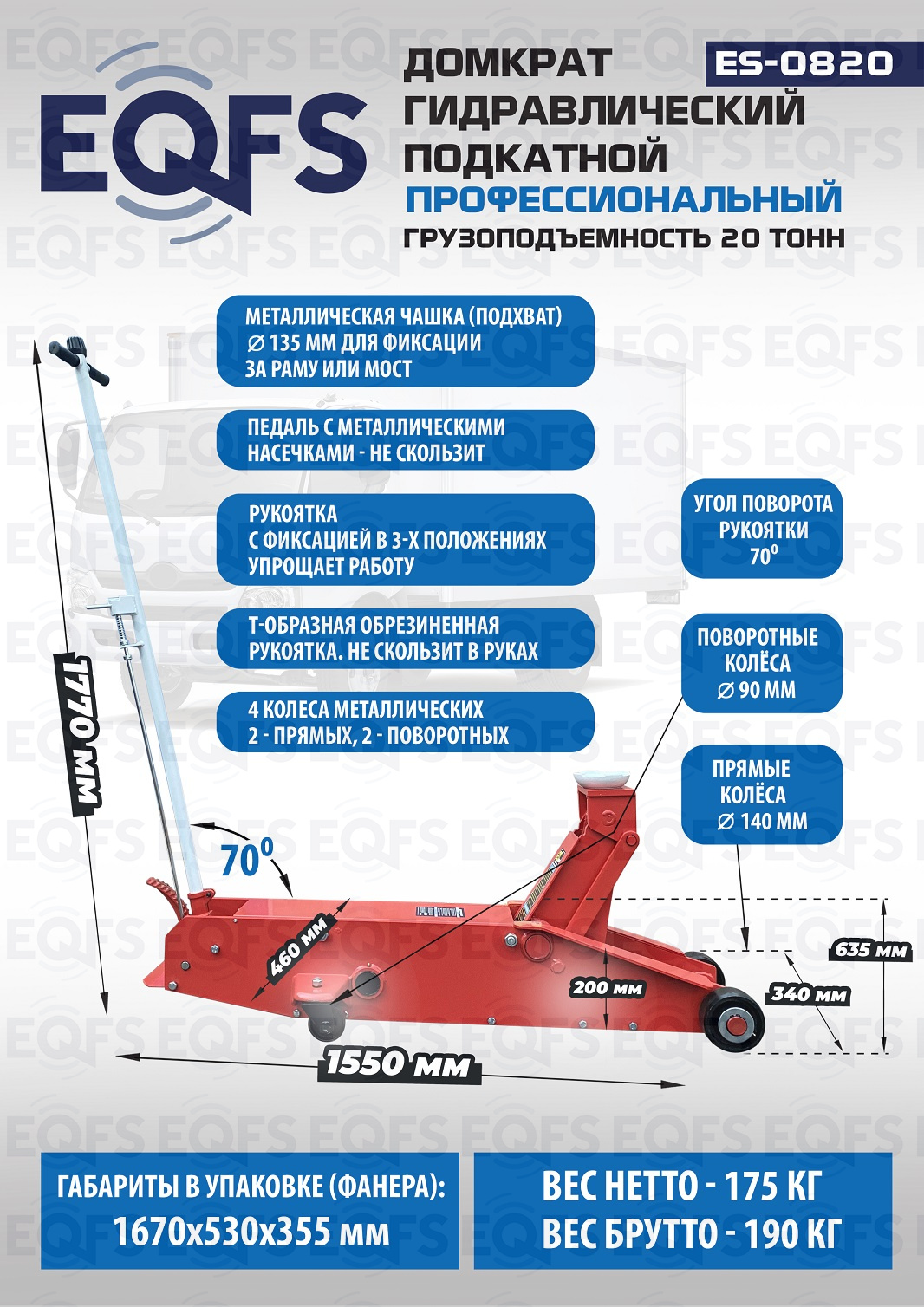Увеличенный диаметр прямых металлических колес грузового домкрата Ǿ-140 мм, позволяет легко транспортировать его по не ровным поверхностям.