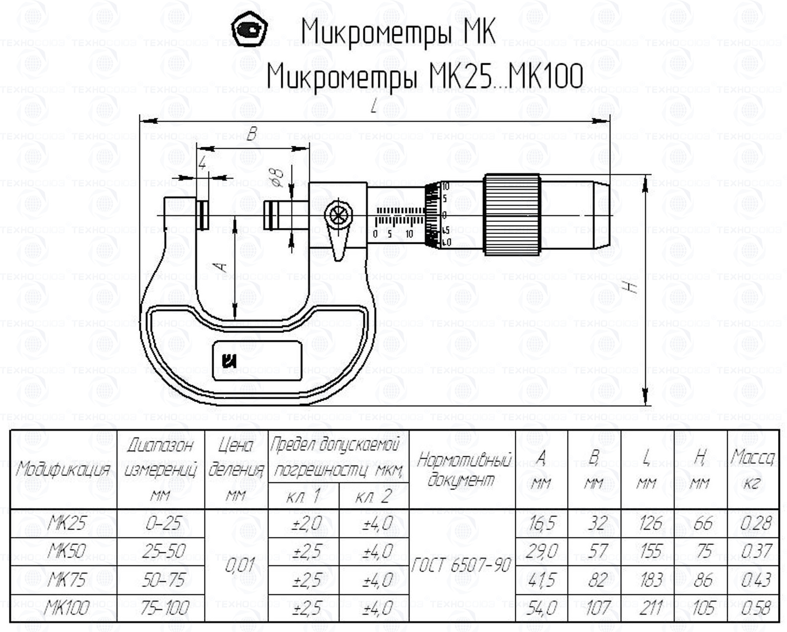 Пример условного обозначения гладкого микрометра с диапазоном измерения от 100 до 125 мм 1-го класса точности - Микрометр МК125-1 ГОСТ 6507-90