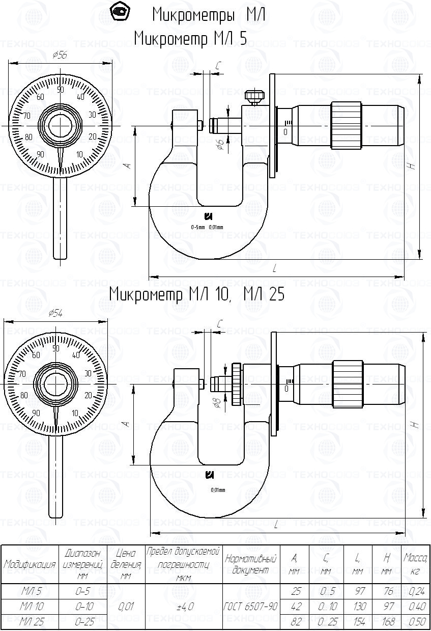 Пример условного обозначения микрометра с диапазоном измерения от 0 до 25 мм - Микрометр МЛ25 ГОСТ 6507-90.