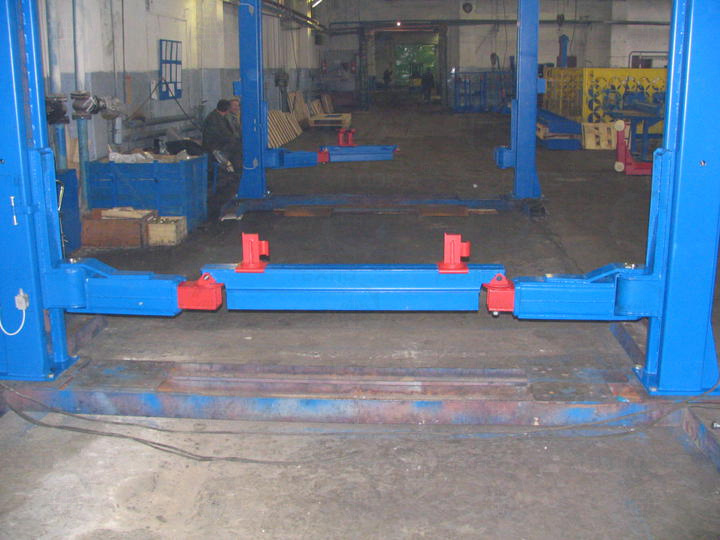 Подъем и опускание автомобиля производится с помощью балок, соединяющих попарно каретки стоек № 1 и 2 и стоек № 3 и 4, подведенных под раму автомобиля. Управление подъемником осуществляется из двух мест: со шкафа аппаратного, установленного на стойке № 1 и с поста управления, установленного на стойке № 3. При этом предусмотрено два режима управления: попарное включение электродвигателей (1+2 стойки и 3+4 стойки) и одновременное включение всех 4-х электродвигателей