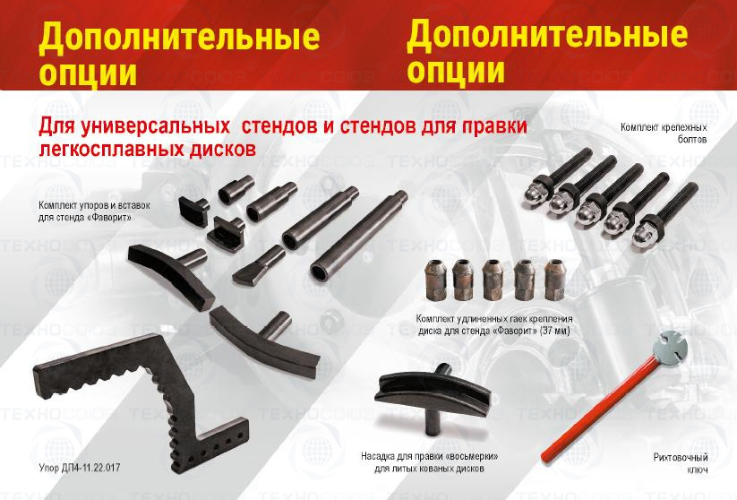 Гидравлический привод стенда "Фаворит-Т" позволяет достигать максимального усилия в зоне правки до 5300 кг**, что, в большинстве случаев, позволяет полностью восстановить геометрию ремонтируемого диска. "Фаворит-Т" комплектуется сменными рихтующими насадками и рабочими штоками, предназначенными для исправления повреждений различного вида.
