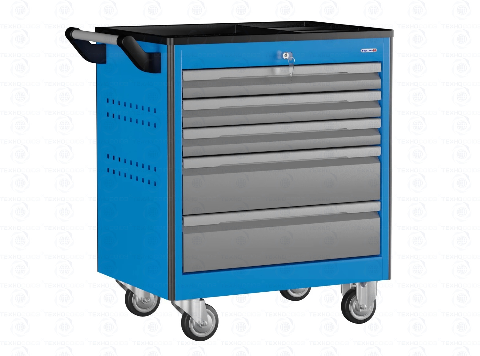5 ящиков. Нагрузка на тележку 220кг. Корпус тележки сварной. Тележка оснащена системой антиопрокидывания новой конструкции, которая блокирует открывание ящиков. На боковых стенках корпуса выполнена квадратная перфорация для установки крючков, держателей и других аксессуаров. Ящики на шариковых телескопических направляющих полного выдвижения. Обеспечен свободный и плавный ход ящиков даже при полной загрузке. Габаритные размеры тележки с учетом колес, лотка и ручки (ВхШхГ), не более: 800x780x490 мм. Вес: 45,2 кг.