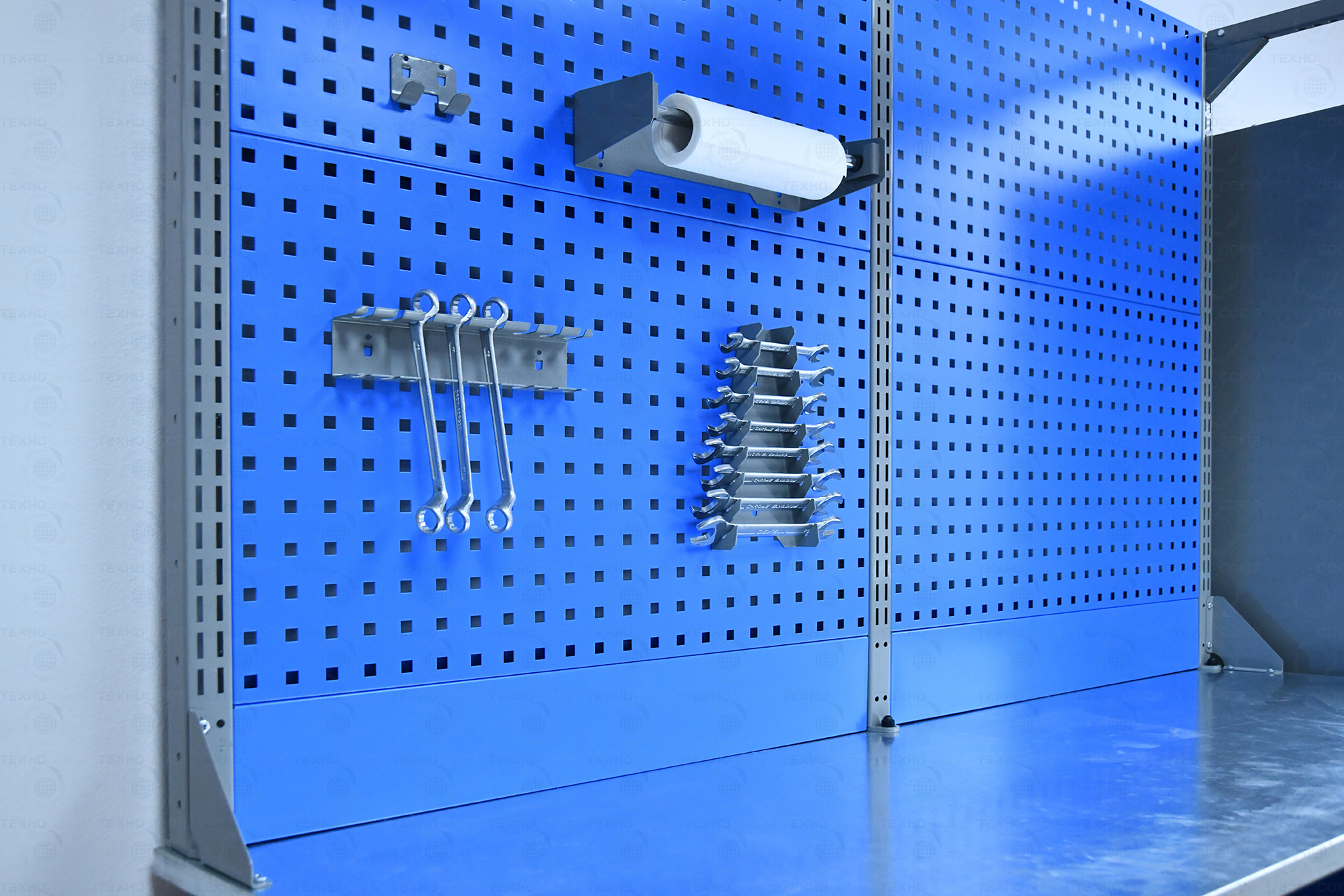 Экран (перфорированная панель) верстака выполнен с квадратной перфорацией 12х12 мм с шагом 38 мм для установки крючков, держателей и других аксессуаров. Экран крепится к столешнице с помощью специальных кронштейнов. Максимальная масса груза, равномерно распределенного по поверхности экрана, составляет 21 кг.
